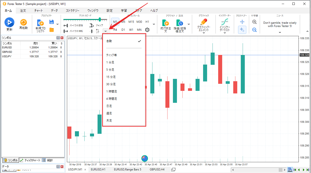 Forex Tester では、新たに追加されたさまざまな銘柄シンボルでテストを行うことができます。株式、インデックス、暗号通貨、そして先物を含む800以上の取引商品の中から選択することができます。