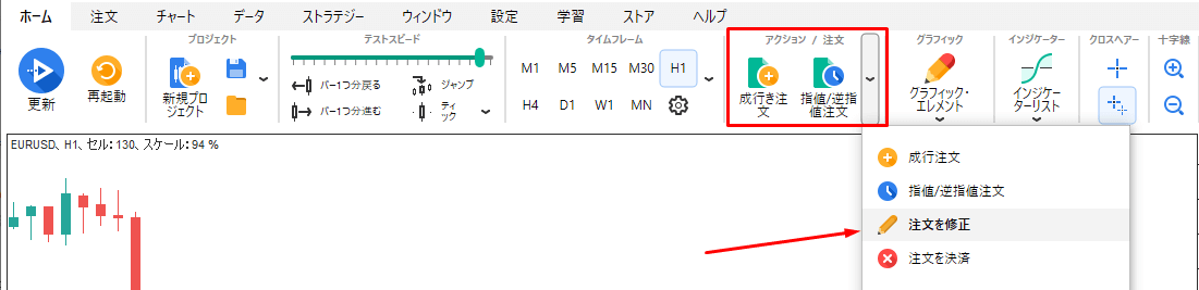 そして、ツールバーにある"選択した注文を修正"ボタンをクリックしてください。(またはキーボードのF4キーを押してください)