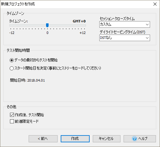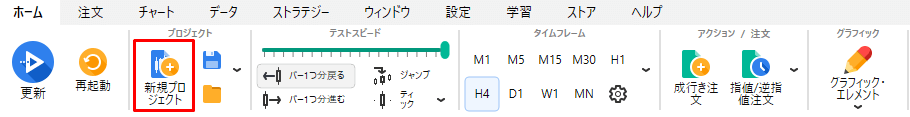 テストを始める前に、過去データの準備をお願いします。 "新規プロジェクト"ボタンをクリックし、バックテストをしたい通貨ペアやテスト期間の選択、証拠金の設定、などができます。