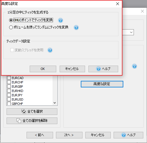 2. "ボリュームを使ってランダムにティックを変換" - 1分足の中に入っているティック数は、そのロウソク足のボリュームと同じになります。ティックは1分足の中にランダムに設置されます。 最初のオプションを使うことを推奨します。なぜなら、その方法が早く、また、良いテストクオリティを提供するからです。