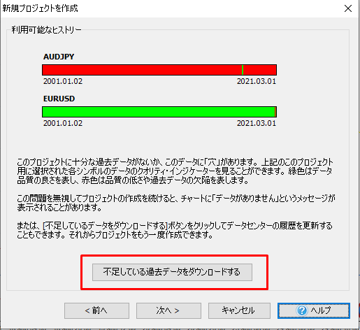 このステップでは、プロジェクトに同じデータが存在しない期間を確認することができます - 赤で表示されていますこの場合は、”不足データをダウンロード”ボタンをクリックして、この通貨ペアのデータをダウンロードしてください。そして、 再度プロジェクトを作成してください。