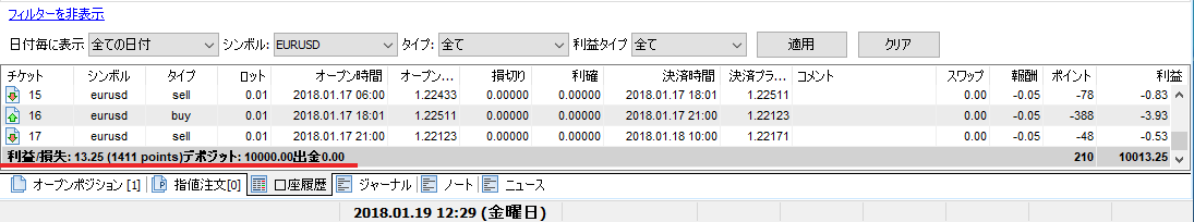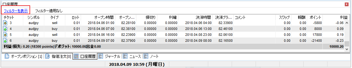 [損益]の行の[アカウント履歴]タブで、損益をピップスで確認できます。
