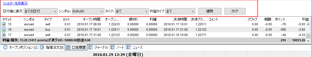 トレード分析をより便利にするために、さまざまなフィルタを使用できます。 “フィルタを表示“リンクをクリックしてください。