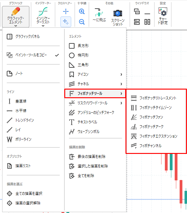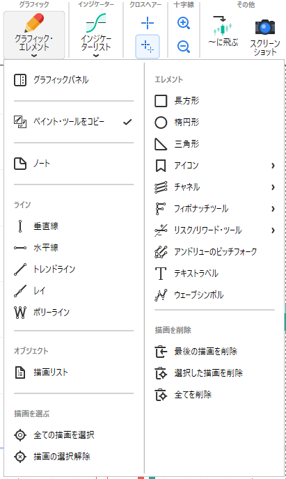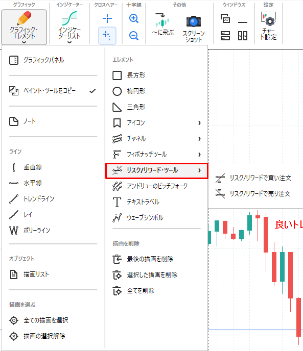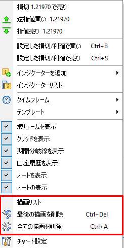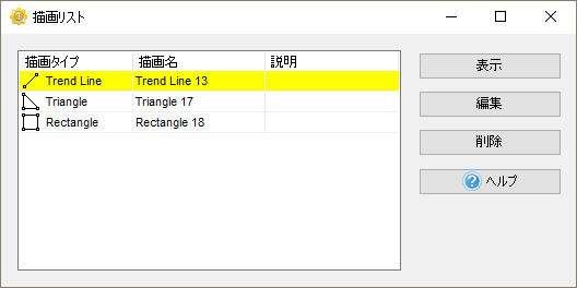 右クリックで描画エレメントを立ち上げる。からショートカットが確認できます。 このメニューから、描画のリストを開けます。リストには、今使っているチャートに入れた図形が表示され、変更や削除ができます。