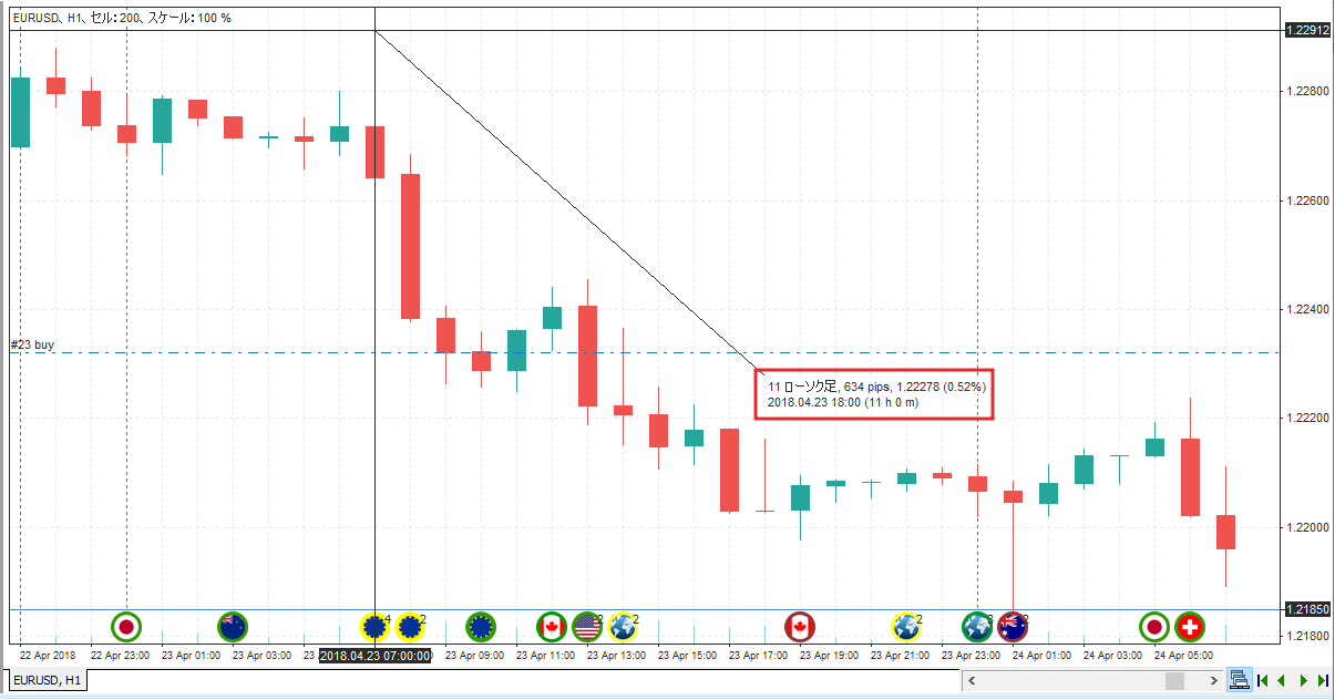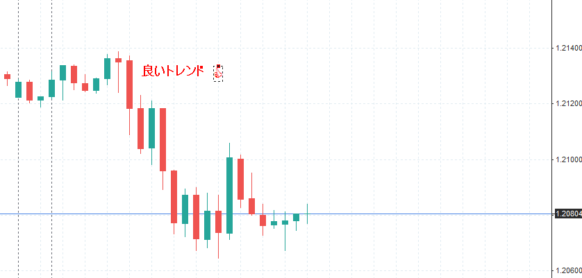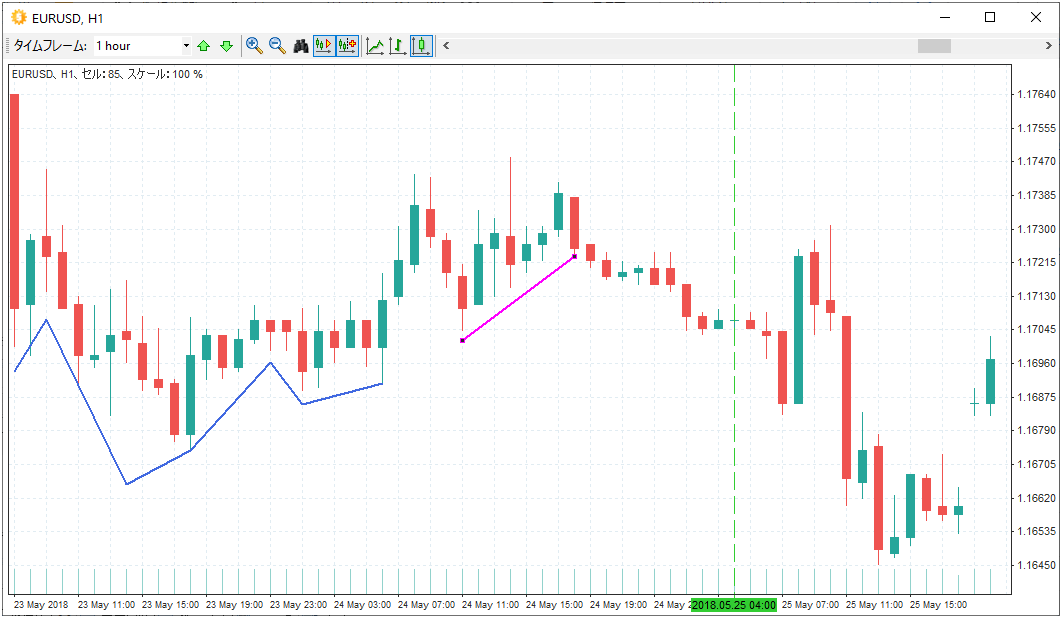 マウスの左クリックで基点を設定し、三角形を描くように描画します。マグネット・モードを有効にすると、ローソク足のコントロール点を把握し、三角◁の二点に引き寄せられます。
