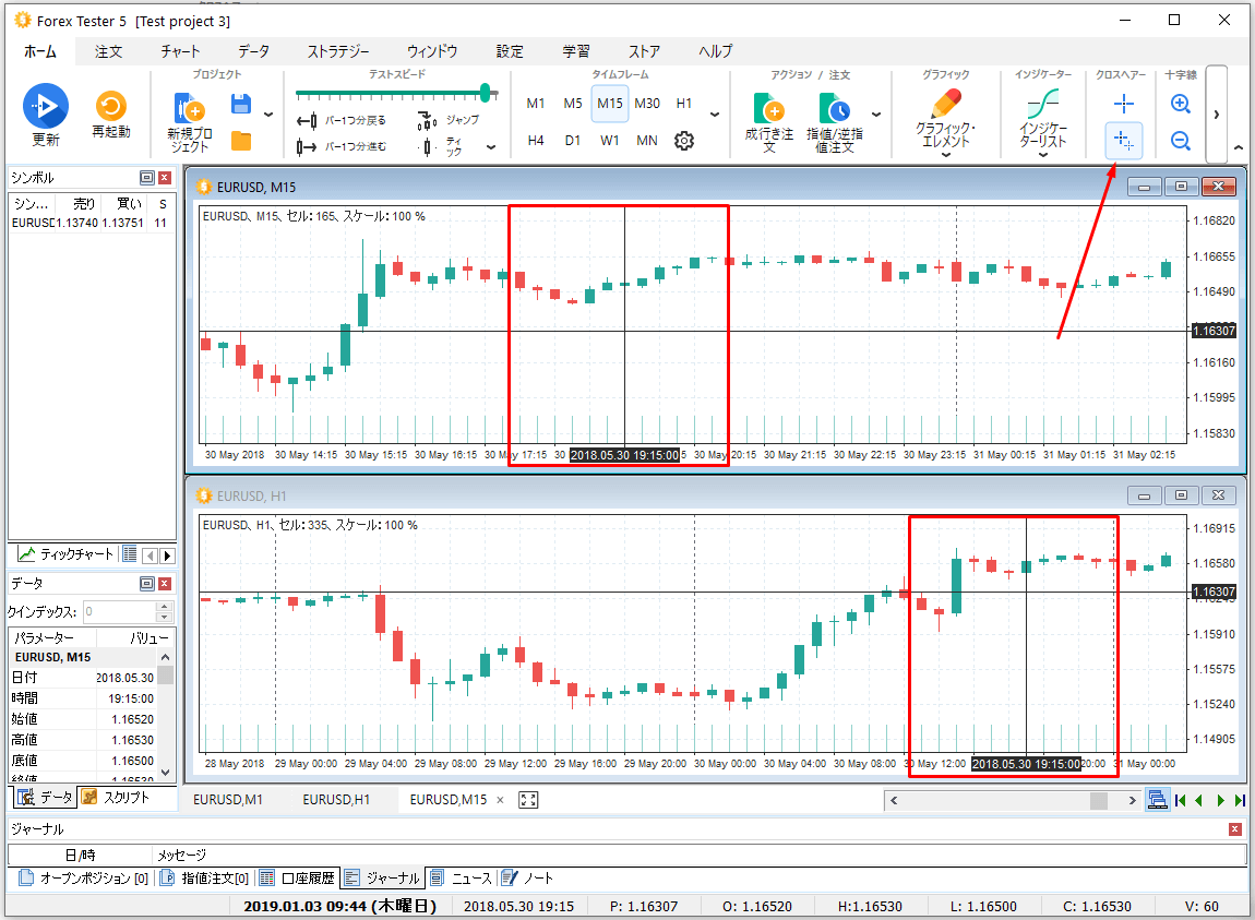 - このボタンをクリックすると、すべてのチャートで十字線を同期できます。 このモードが有効になっていると、すべてのチャート上に十字型マウスポインタが表示され、すべての時間枠の違いに応じて表示されます。グローバル十字線カーソルを有効/無効にするには、ツールバーのボタンをクリックします。 それから十字線カーソルを通常通りに使用してください。