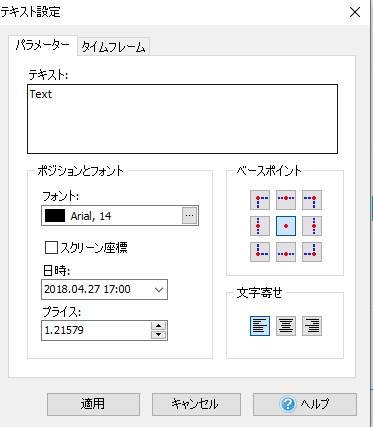 このウィンドウでは、チャートに表示されるテキストの書き込み(フォント・サイズ・色の設定・テキスト入力)ができます。テキストの追加を終了するには、適用ボタンをクリックしてください。このあと、チャート上にテキストが表示されます。