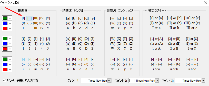 ウェーブシンボルツールは、チャートにマークされる表示をウェーブのマークを便利にします。それぞれのシンボルを選択し、左クリックをして、チャートに入力します。