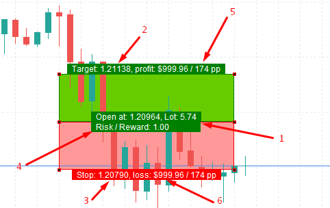 なお、チャートに適用した後も、ツールの移動、サイズ変更、プロパティの変更、SL(損切)/TP(利確)レベルの変更はいつでも可能です。この場合、すべての値は自動的に再計算されます。