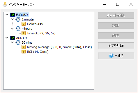 ここで、インジケーターの編集、インジケーターの削除、すべてのインジケーターをまとめて削除ができます。