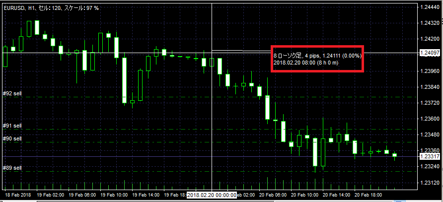 - チャート上でマウスの左ボタンを押しながら → 測定する領域までマウスをドラッグして、十字線を高度なルーラとして使用することができます。