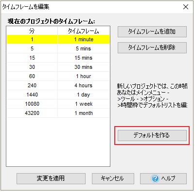 新しいプロジェクトごとにカスタムタイムフレームを作成する必要はもうありません。1回だけ作成し、新しいタイムフレームリストをデフォルトリストとして保存します。