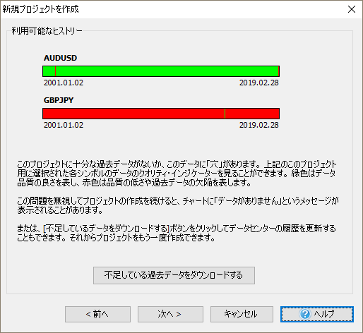 新規プロジェクト用に選択されたすべてのシンボルに対して十分なデータがあるかどうかを確認してください。 データが足りない場合は、必要なデータをダウンロードするか他のオプションを選択できます。